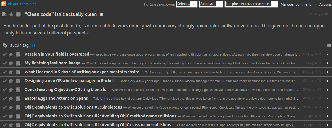 A mes débuts d’utilisation de Tiny Tiny RSS, j’ai commencé par ajouter et suivre de sites d’agrégation de contenu tel que Hacker News ou Human Coders. Lorsque je lis un contenu intéressant, j’ajoute ce dernier à mes flux à suivre. C’est ainsi que j’ai constitué la base des flux que je lis aujourd’hui.