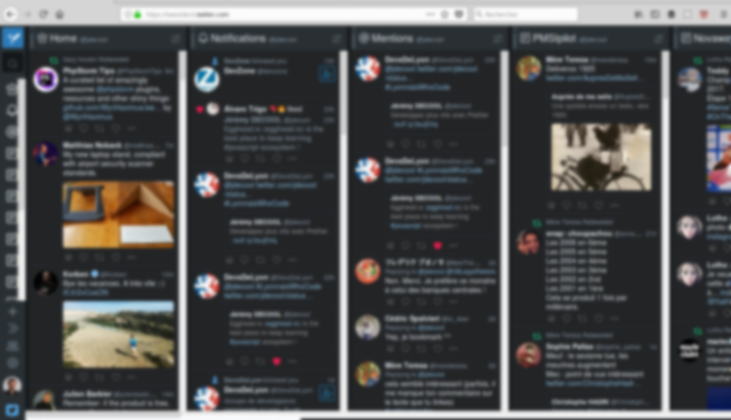 C’est toujours aujourd’hui ce qui constitue l’essentiel de mes sources d’information. En parallèle, j’utilise Twitter. Ma timeline est essentiellement construite avec des personnes tweetant de manière régulière sur des sujets liés à l’informatique. J’utilise également les listes Twitter afin de catégoriser les personnes qui je suis. Pour m’aider dans cette tâche, je me sers de TweetDeck.