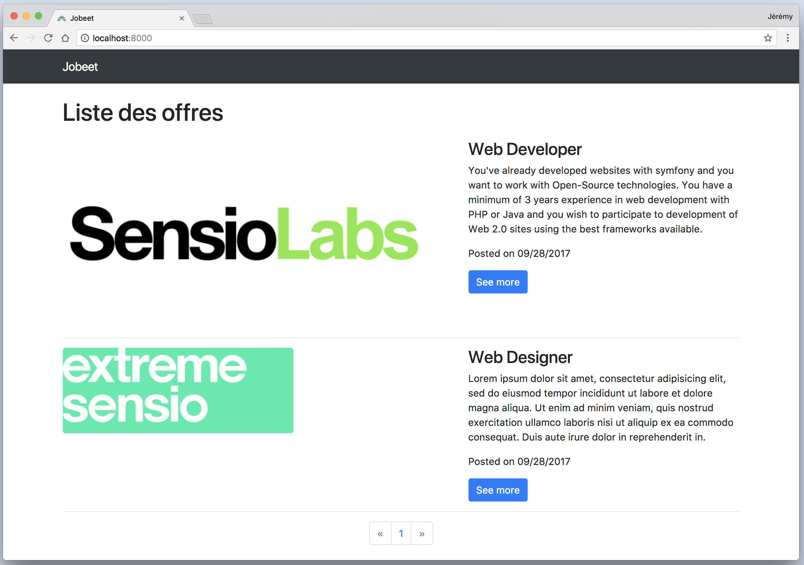 }Nous connaissons à présent le fonctionnement des contrôleurs et comment ces derniers communiquent avec la vue pour afficher nos données à l’utilisateur. Nous allons maintenant pouvoir afficher les premières pages de notre projet Jobeet. Commençons par la page de listing des offres d’emploi.