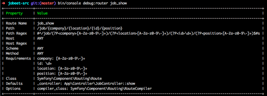 Si nous réfléchissons d’un point de vue SEO, nos URL de type /job/1 ne sont pas très explicites et pourraient pénaliser notre référencement dans les moteurs de recherche. Une URL du type /job/sensio-labs/1/web-developer serait plus pertinente car elle décrit mieux la ressource à laquelle elle fait référence. Effectuons cette modification :