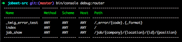 Au fur et à mesure que nous allons ajouter des fonctionnalités à notre application, cette dernière va grossir et contenir de plus en plus de code et de configuration. Il peut être parfois utile de lister l’ensemble des routes disponibles sans pour autant devoir parcourir les différents fichiers de configuration. Pour cela, Symfony met à disposition des développeurs une commande permettant d’afficher ces dernières :