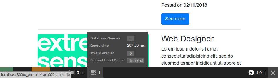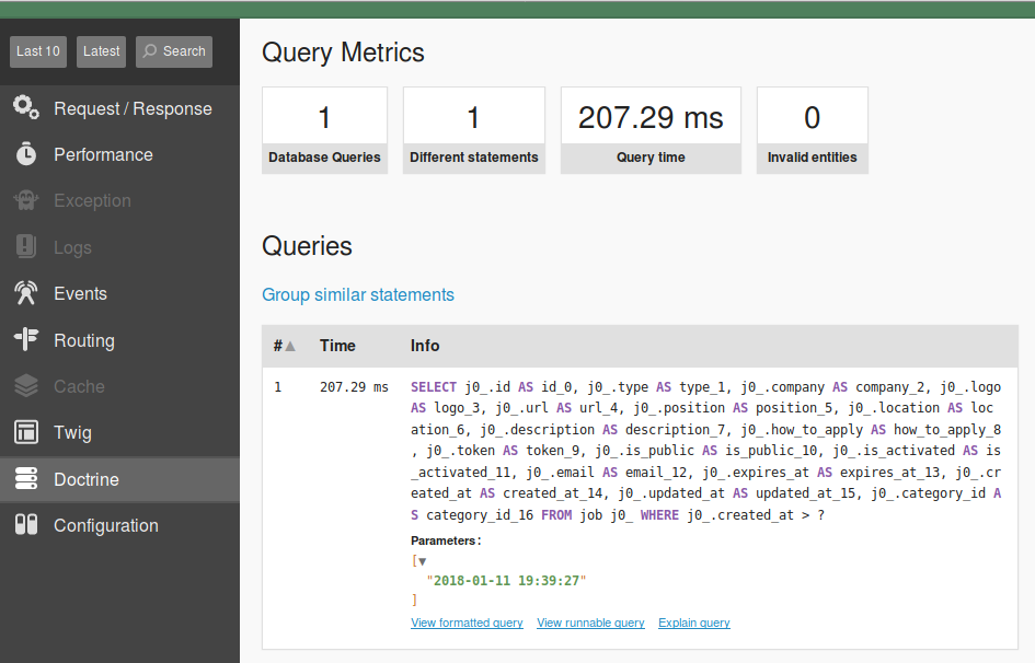 2018-02-10T19:32:20+01:00 [debug] SELECT j0_.id AS id_0, j0_.type AS type_1, j0_.company AS company_2, j0_.logo AS logo_3, j0_.url AS url_4, j0_.position AS position_5, j0_.location AS location_6, j0_.description AS description_7, j0_.how_to_apply AS how_to_apply_8, j0_.token AS token_9, j0_.is_public AS is_public_10, j0_.is_activated AS is_activated_11, j0_.email AS email_12, j0_.expires_at AS expires_at_13, j0_.created_at AS created_at_14, j0_.updated_at AS updated_at_15, j0_.category_id AS category_id_16 FROM job j0_ WHERE j0_.created_at > ?Un moyen plus simple d’accéder à ces informations est d’installer le composant symfony/profiler-pack.